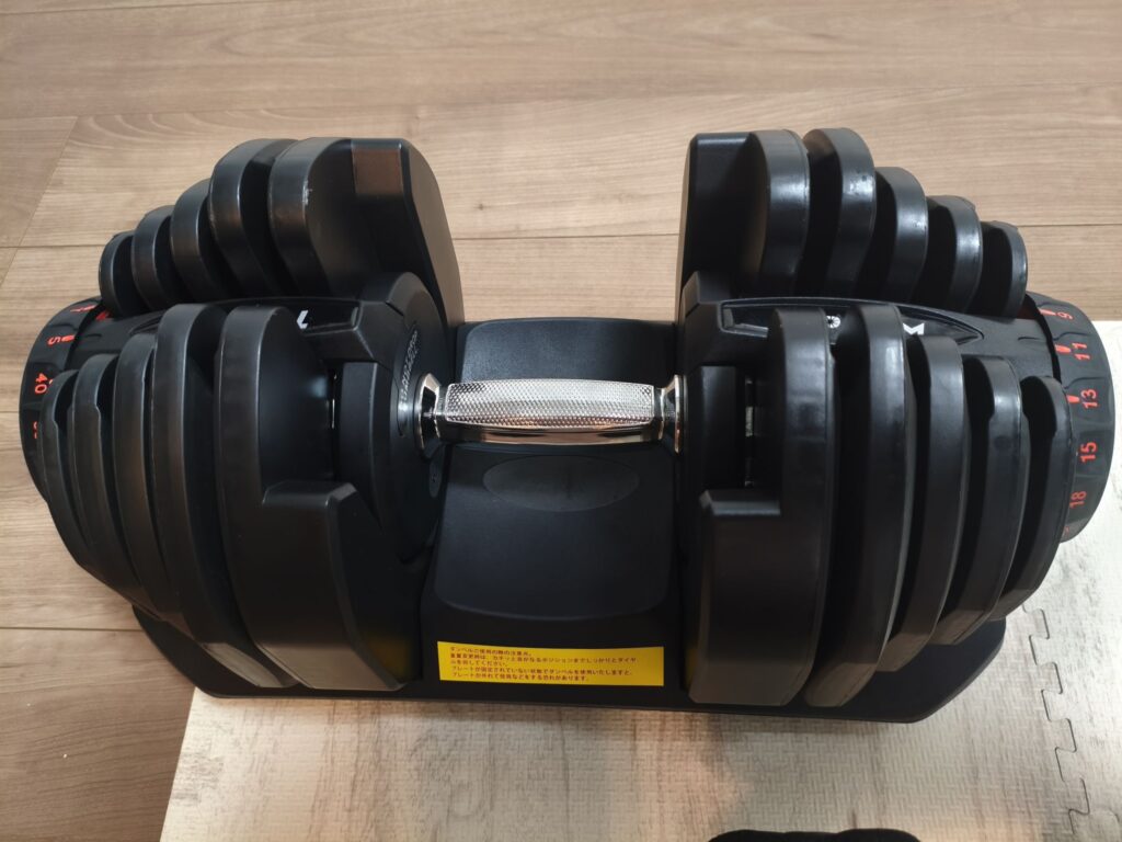 40kgもあるダンベルがこれくらいの大きさに収まってしまうのはやはり可変式ダンベルならでは。